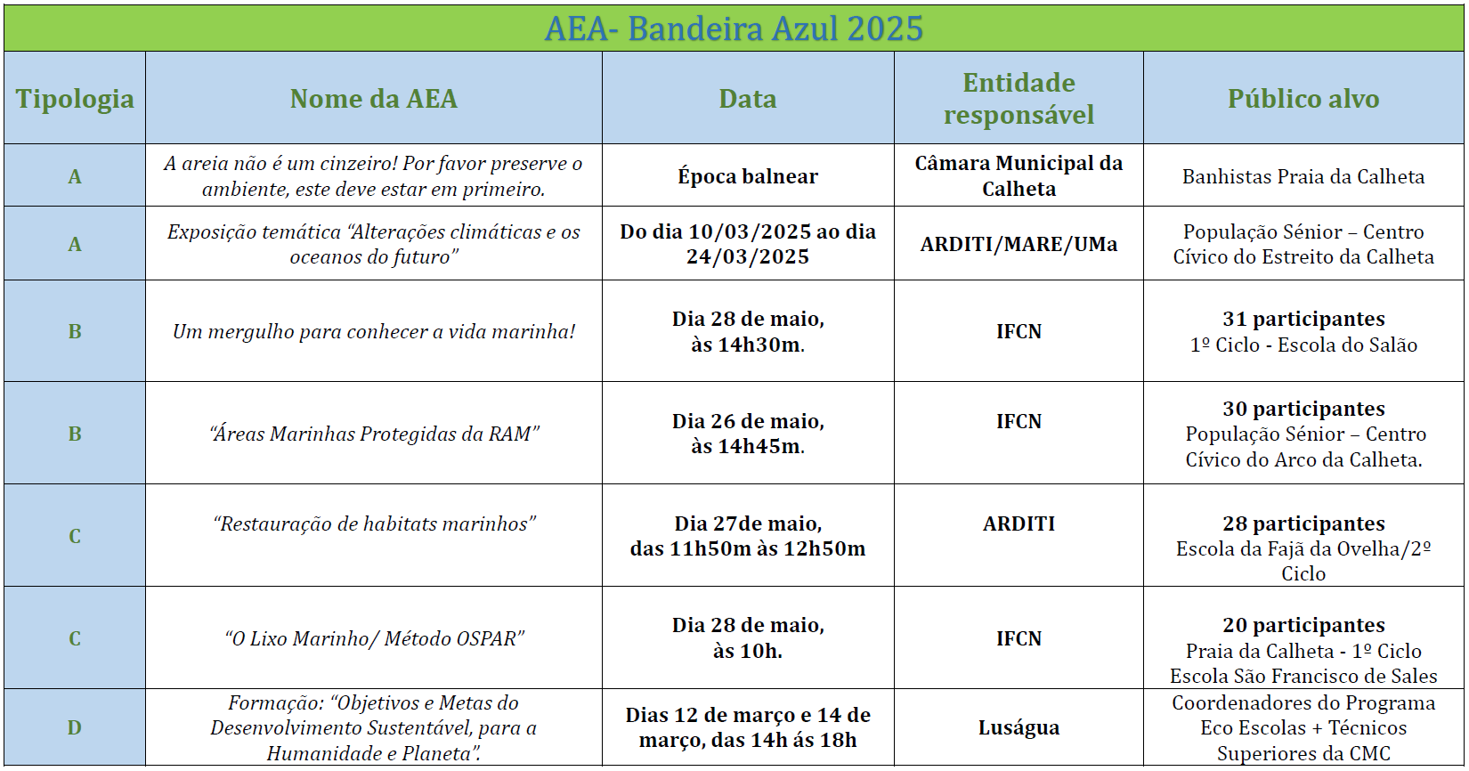 | A Geodiversidade da minha Praia | 9 de maio de 2023 | Praia da Calheta | Secretaria Regional do Ambiente e Alterações Climáticas | Discentes de uma turma de 10º ano, da Escola Básica e Secundária da Calheta |
