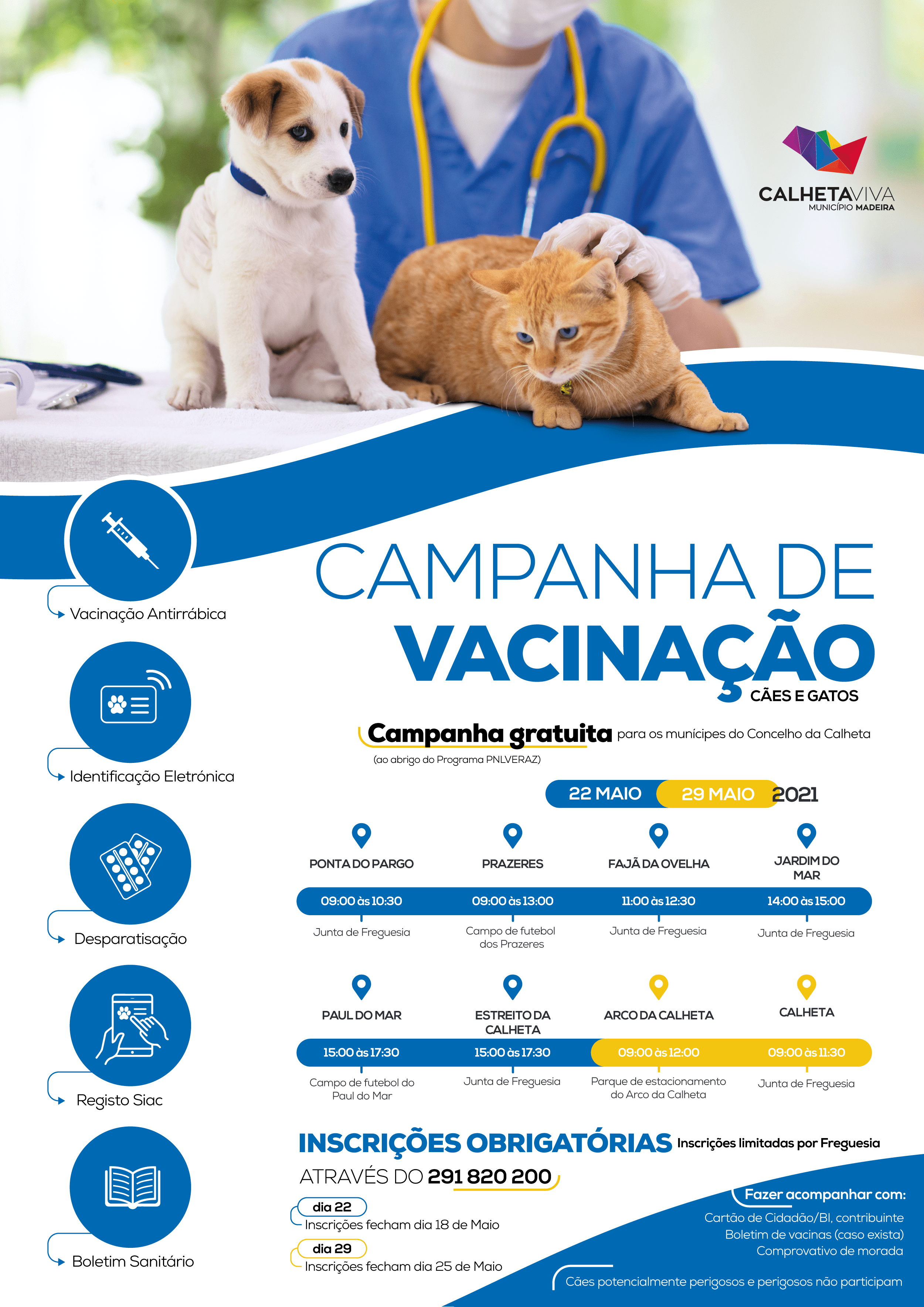 O Município da Calheta informa que decorrerá nos próximos dias 22 e 29 de maio mais uma campanha de vacinação para animais de companhia. A campanha volta a ser gratuita para os residentes, ficando todos os encargos à responsabilidade da autarquia local. A intervenção inclui vacinação antirrábica, identificação eletrónica, desparasitação interna, registo SIAC e boletim sanitário.